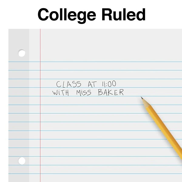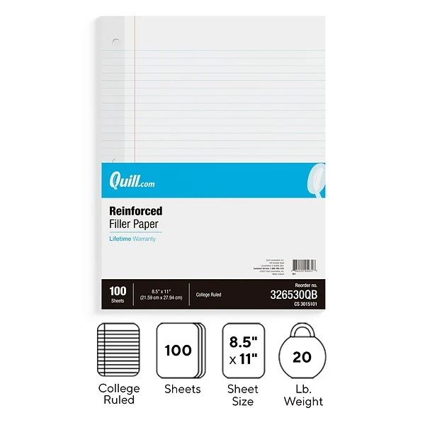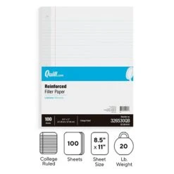 Take detailed notes, complete assignments or record information with this reinforced filler paper. The college-ruled format with conveniently spaced margins keeps your handwriting neatly aligned, while the white color helps ink and marker stand out on the page for better readability. This Quill Brand Business Essentials 8.5 x 11-inch reinforced filler paper comes with reinforced three-hole-punched edges, so it’s ready to add to binders.
