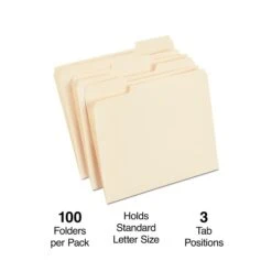 Make filing documents easy with these standard letter-size manila file folders. The oversized 1/3-cut tab layout provides ample room for file names, account numbers and other essential information, while the standard construction is ideal for everyday handling. These letter-size manila file folders feature a versatile design that’s ideal for use in vertical or lateral file systems.