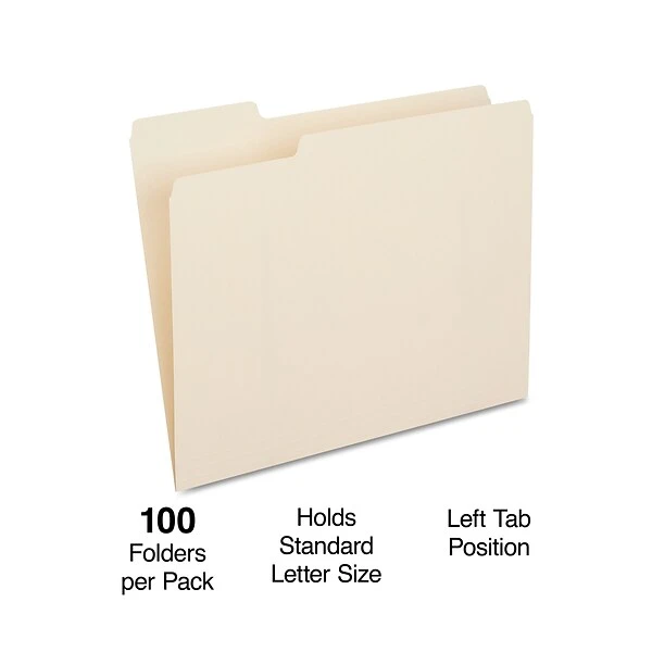 Quill standard manila file folders keep important documents safely filed away and loose papers in a single location. The tabs provide a convenient way to label the file folders for quick reference. The folders’ standard letter size means that most documents fit in them without wrinkling or bending the corners, and the medium-weight material of the folders holds up through active use.
