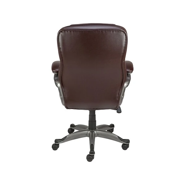 Complete your corner office with this Osgood high-back executive chair. Segmented padded cushions and matching padded armrests and the built-in lumbar support for maximum comfort. The bonded leather upholstery features a warm brown hue and contrast stitching for understated style, giving your office a professional look. Simple controls for tilt tension, tilt lock and seat height adjustment let you configure this chair to meet your personal preferences. This Osgood high-back executive chair comes with a five-star base for stability, and durable rolling casters provide effortless movement across carpeted or hard flooring surfaces.