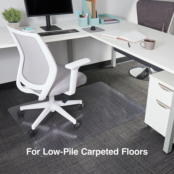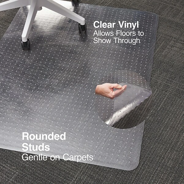 Extend the life of your low pile carpet (up to 3/8″ thick including padding depth) by protecting against chair caster wear and tear. The perfect addition to your workspace, this chair mat provides a smooth surface that enhances ergonomic comfort by allowing your rolling office chair to move freely. Easy to handle, this chair mat features rounded AnchorBar cleats (studs) that hold your mat in place and are gentle on carpets and fingers (no sharp spikes). This chair mat is made with durable vinyl that is GREENGUARD Gold Certified for low chemical emissions to promote a healthier workspace. Designed for use on carpeted surfaces only, do not use on hard floors.