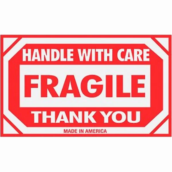 Self-adhesive “HANDLE WITH CARE FRAGILE THANK” labels for international box packaging and pallet shipping. See Product Details chart for more information.